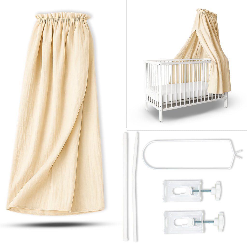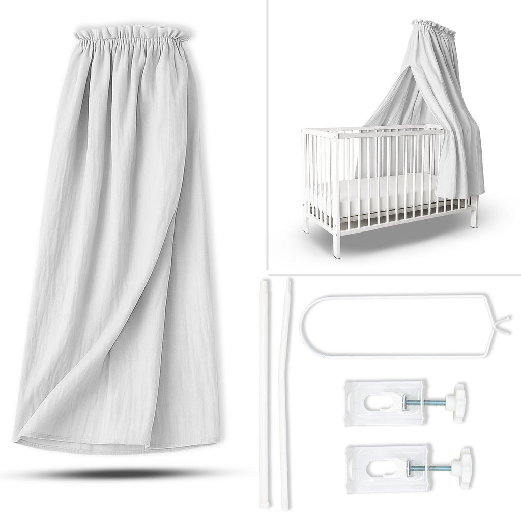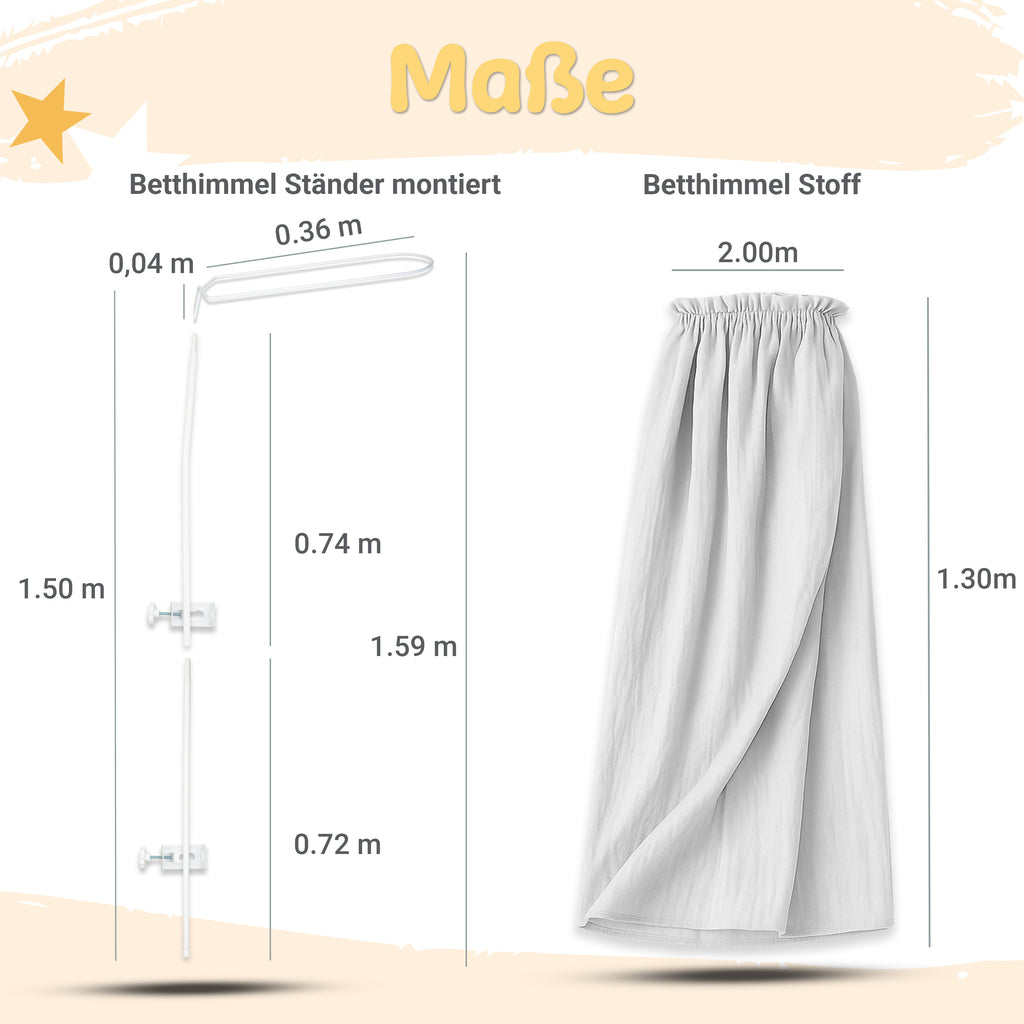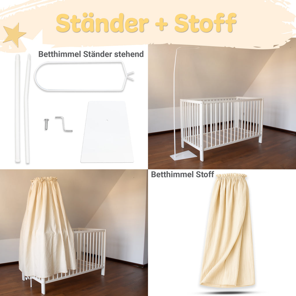 Betthimmel aus Musselin (130 cm) – Varianten: Stoff / mit Klammer-Stange / mit Standgestell – Creme & Hellgrau