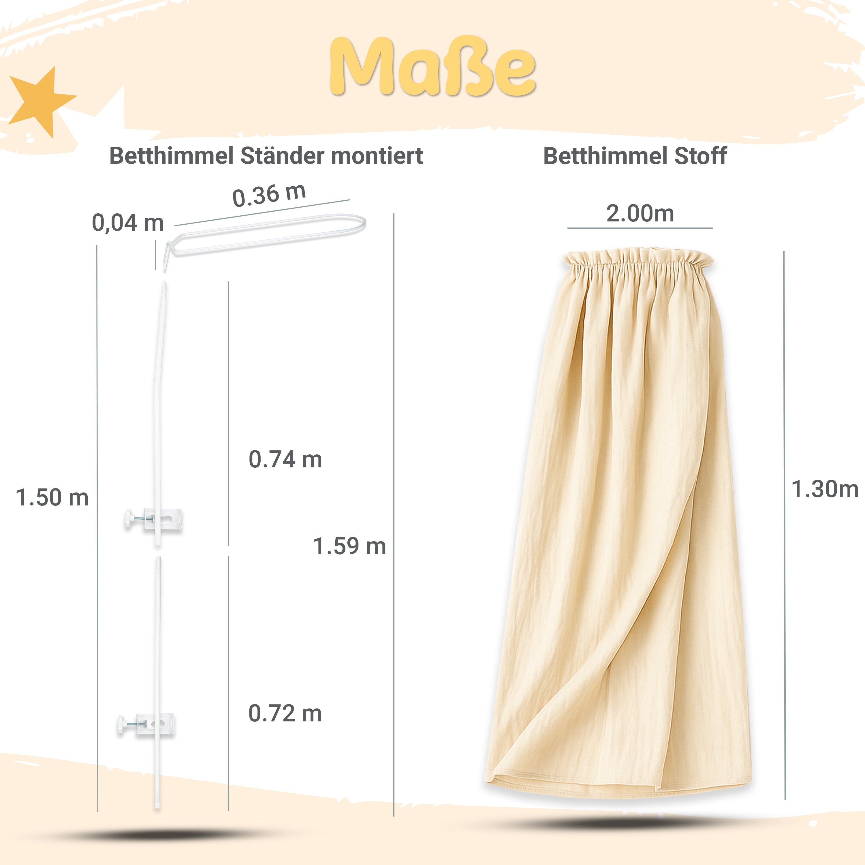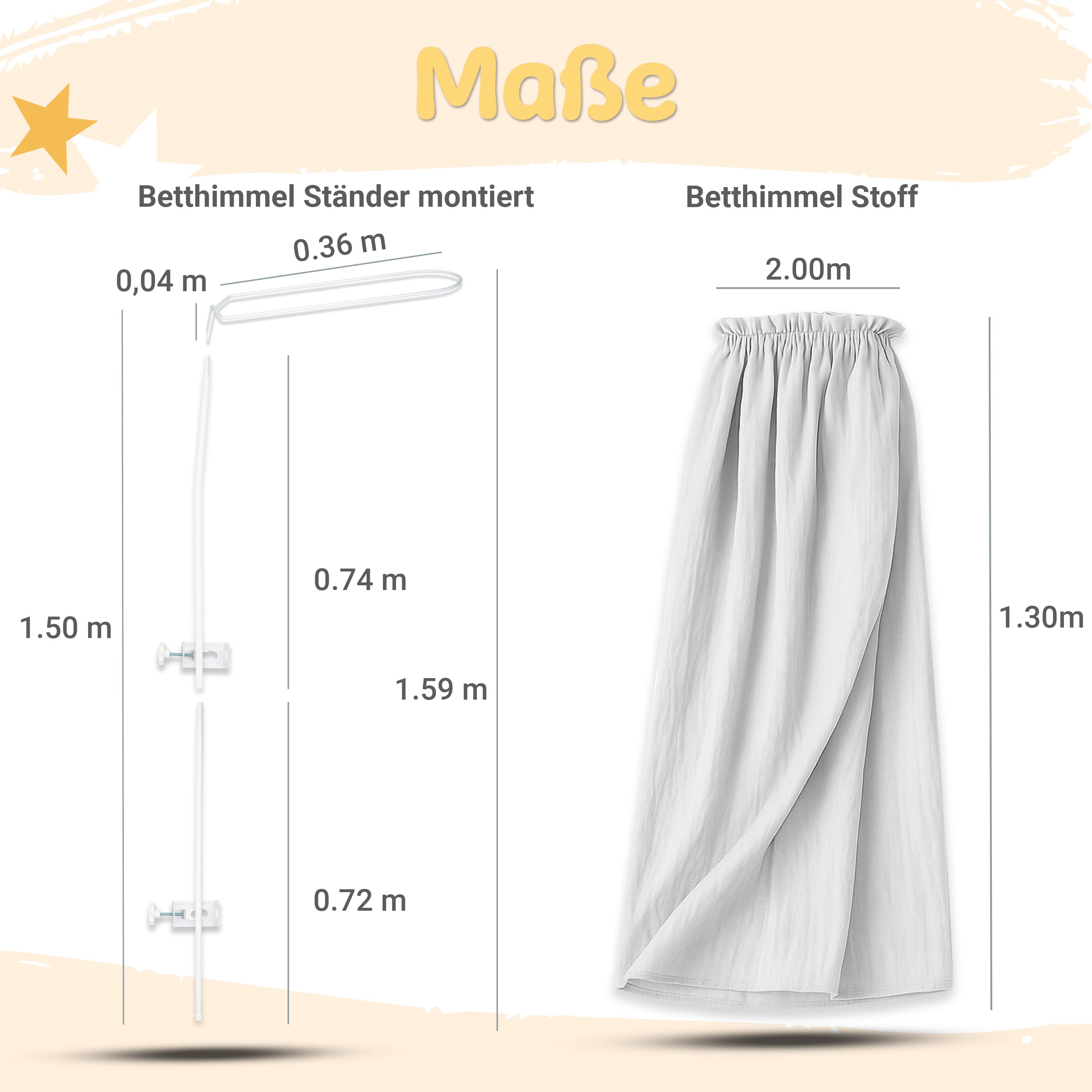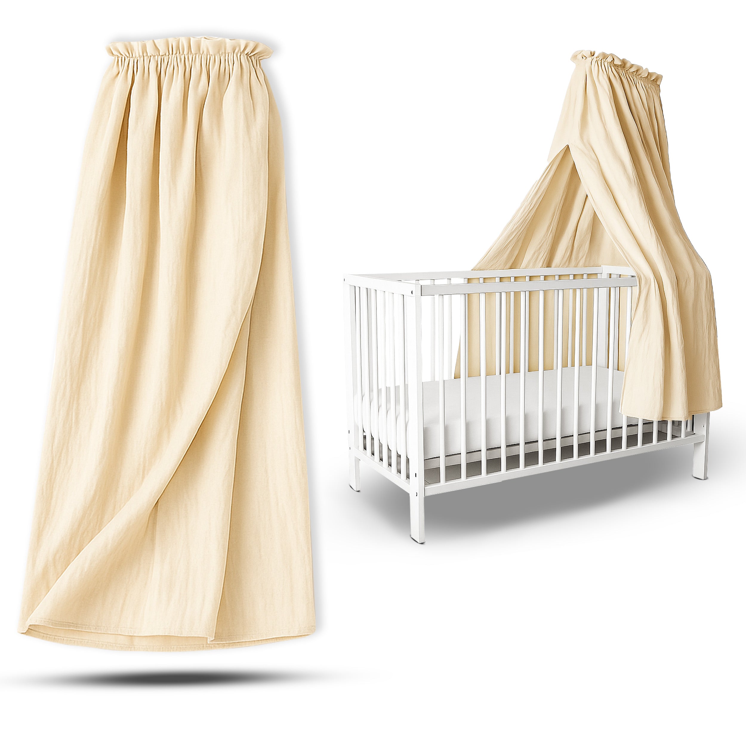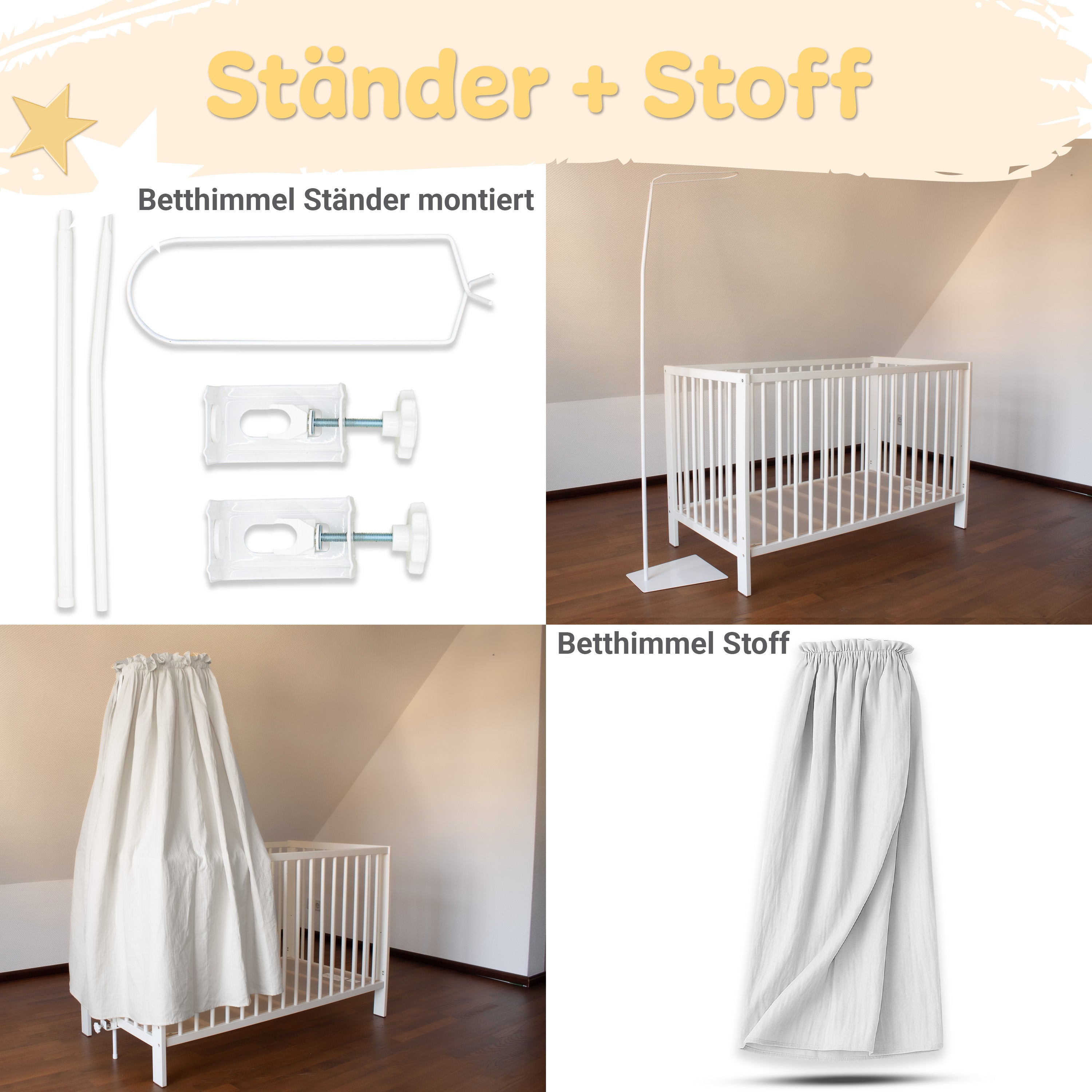 Betthimmel aus Musselin (130 cm) – Varianten: Stoff / mit Klammer-Stange / mit Standgestell – Creme & Hellgrau