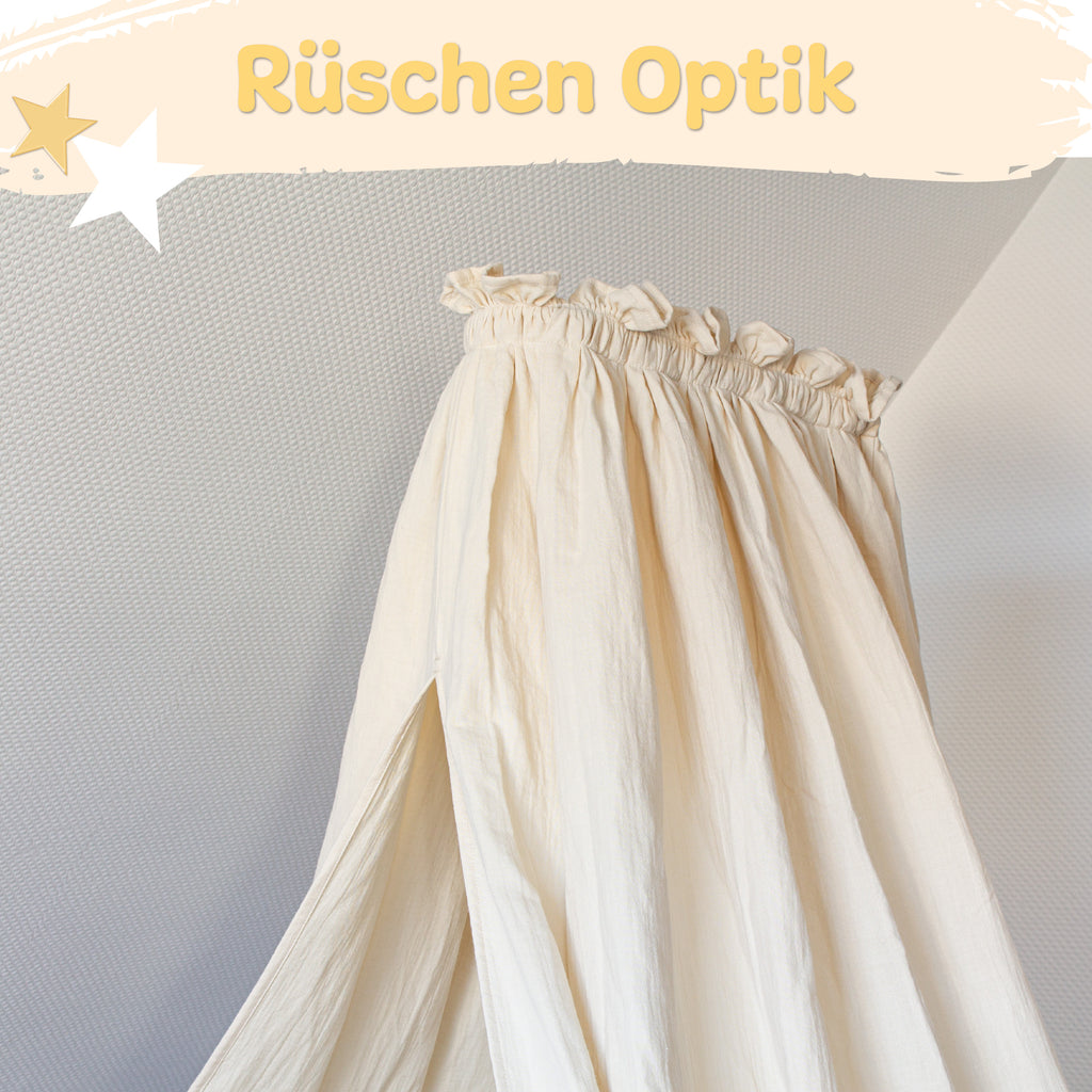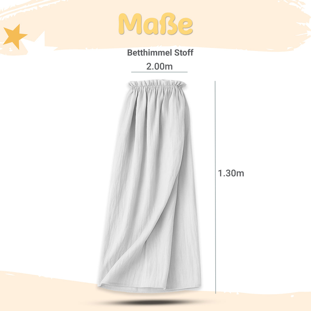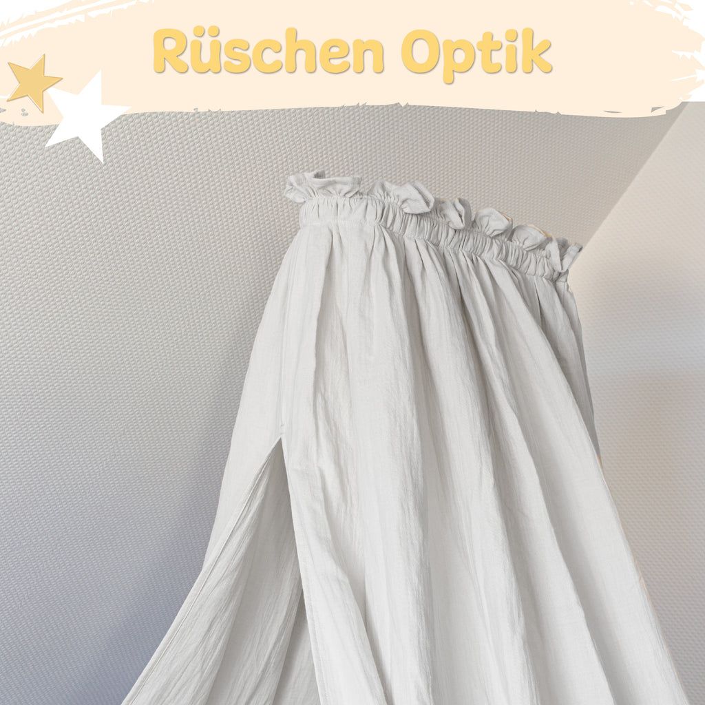 Unser liebevoll gestalteter Betthimmel aus weichem Musselin (Länge: 130 cm) schafft sanften Lichtschutz und eine Atmosphäre voller Geborgenheit. Die zarte Rüschenoptik oben und die zeitlosen Farben Creme und Hellgrau fügen sich harmonisch in jedes Kinderzimmer.