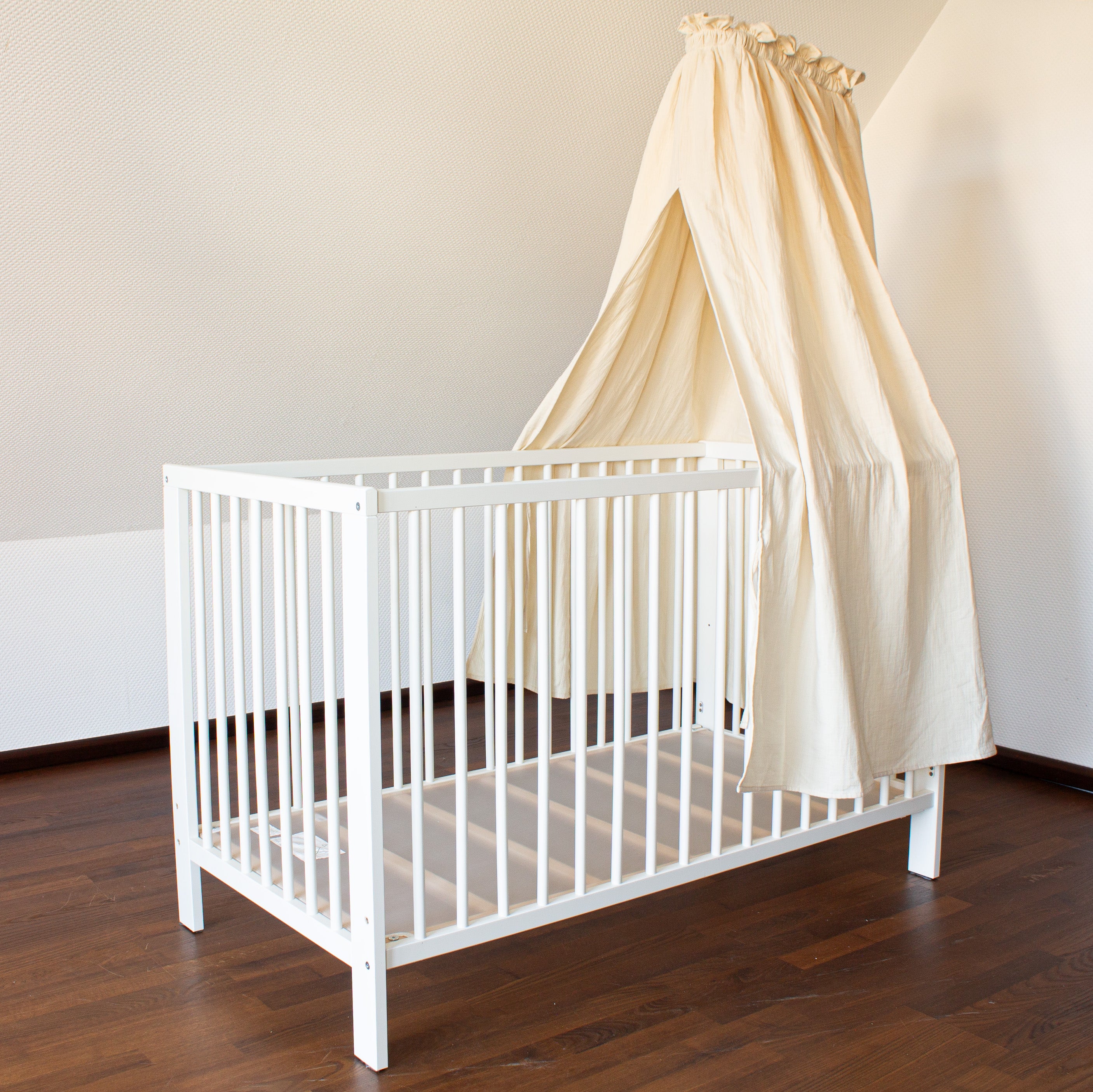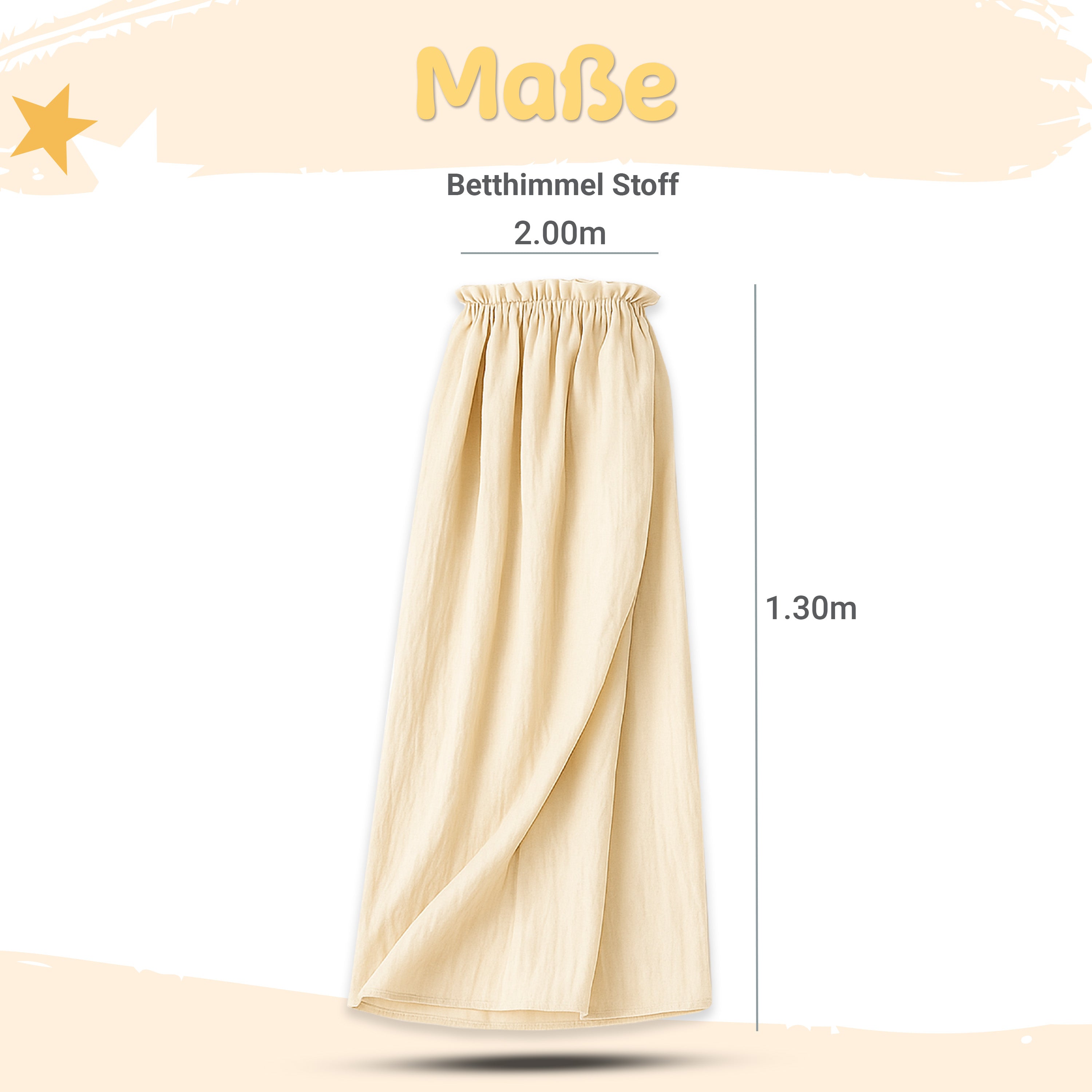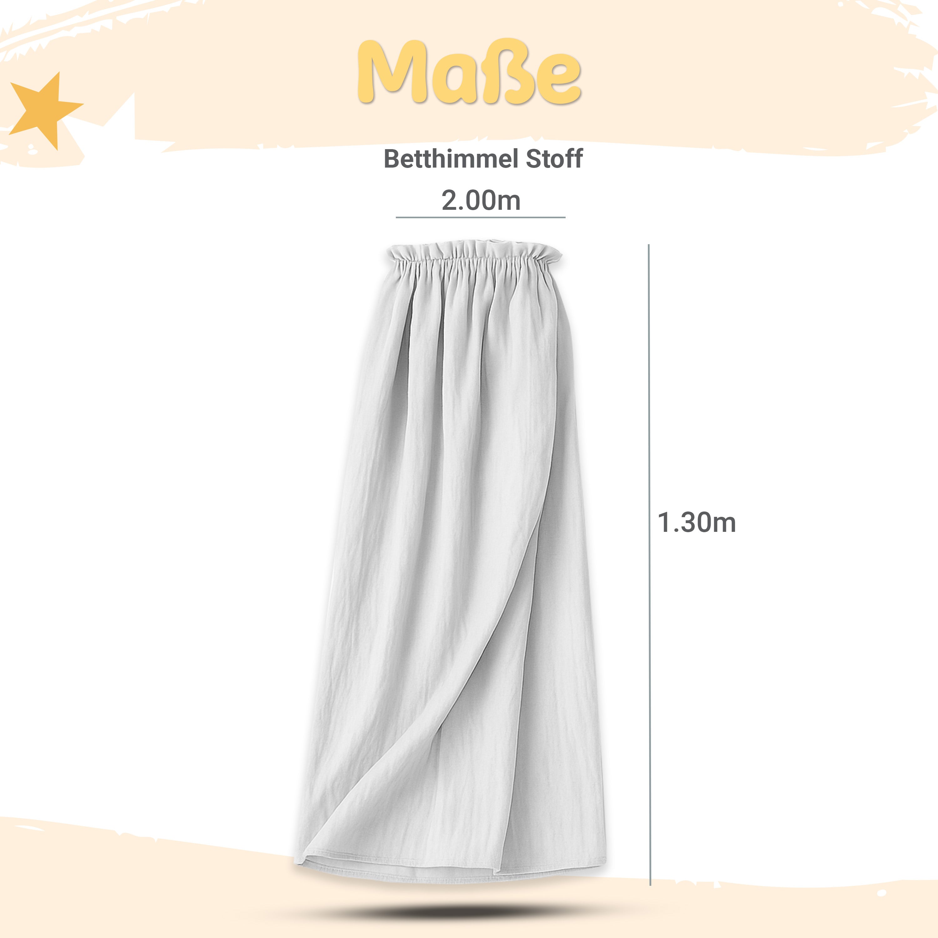 Unser liebevoll gestalteter Betthimmel aus weichem Musselin (Länge: 130 cm) schafft sanften Lichtschutz und eine Atmosphäre voller Geborgenheit. Die zarte Rüschenoptik oben und die zeitlosen Farben Creme und Hellgrau fügen sich harmonisch in jedes Kinderzimmer.