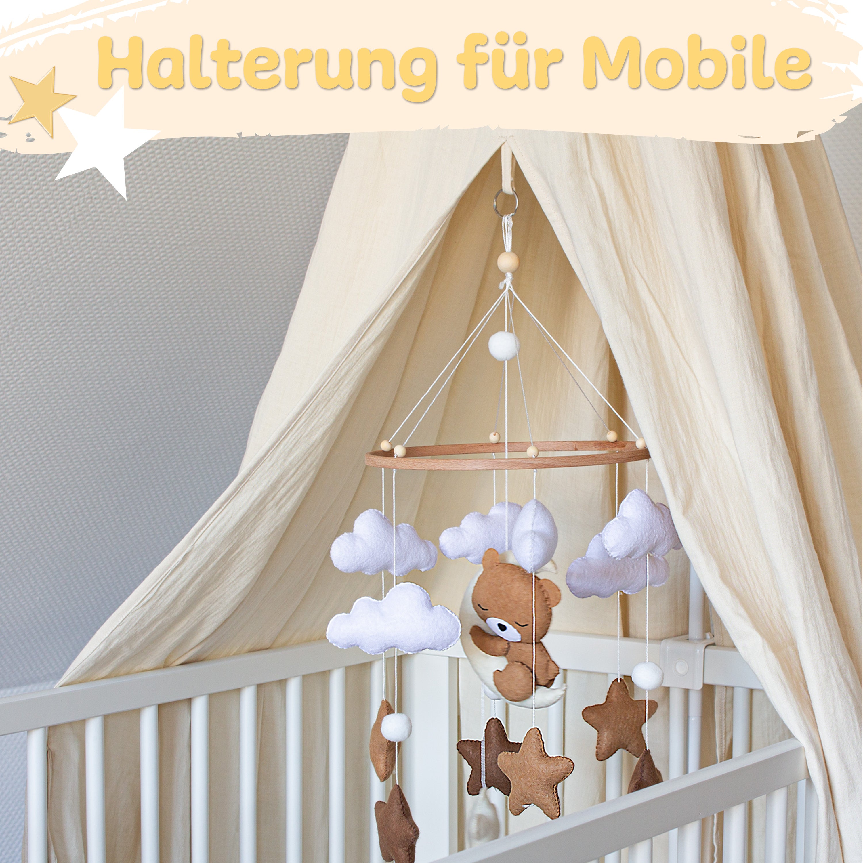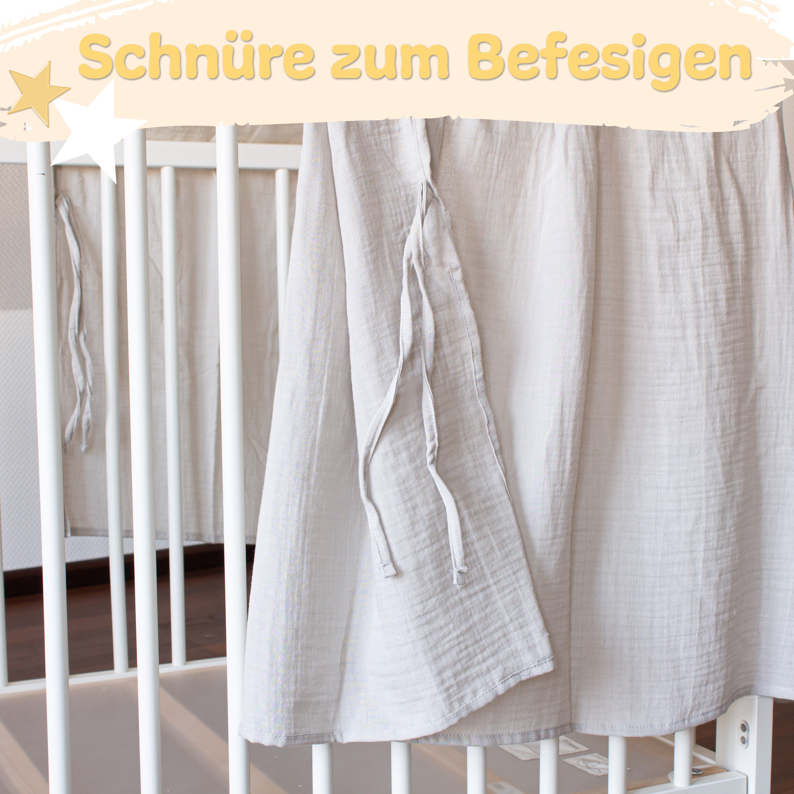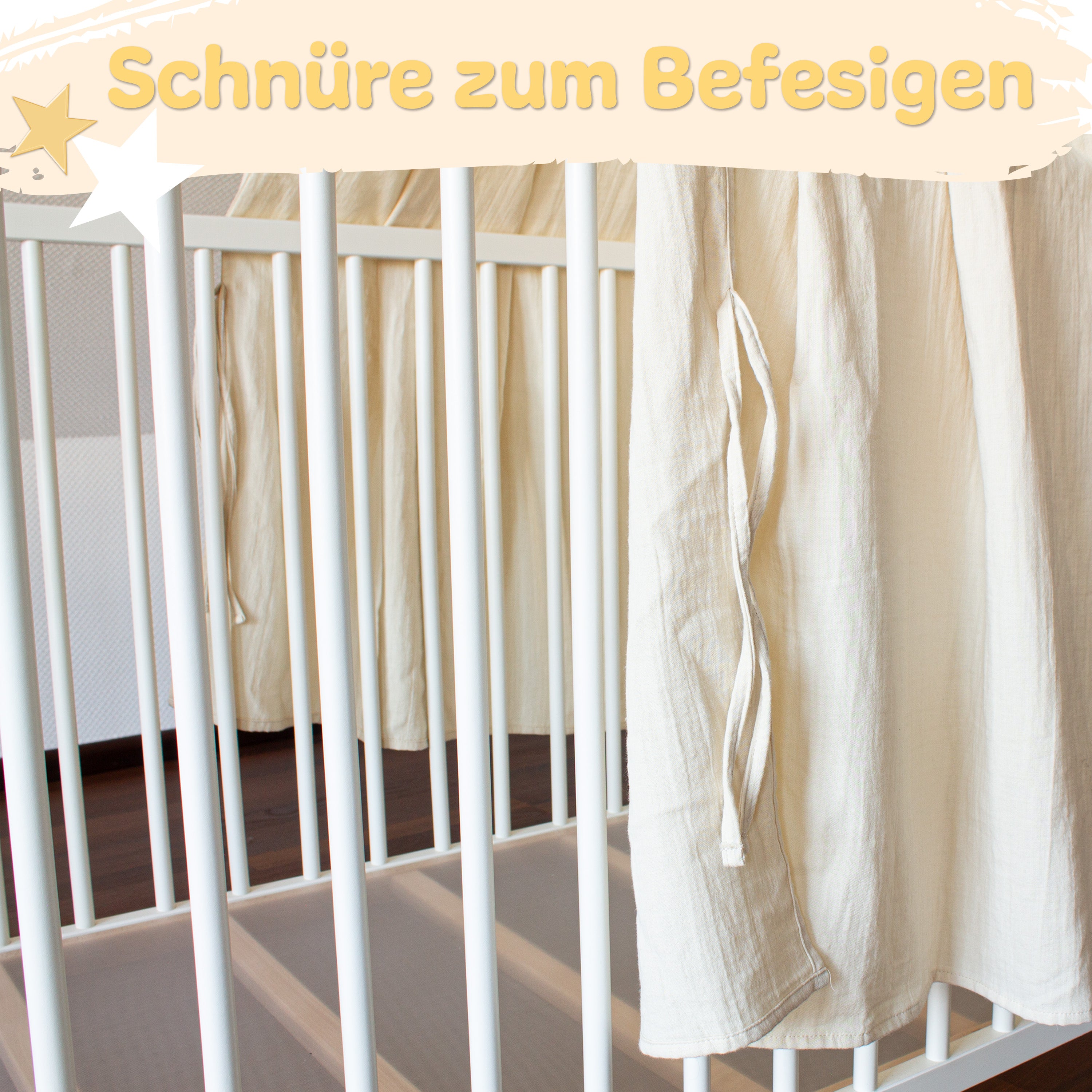 - Stoff + montierte Klammer-Stange: kinderleicht am Babybett fixierbar, ganz ohne Schrauben.